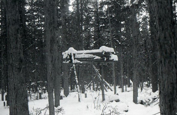 Во-первых, по тропе недавно прошёл мансийский охотник, и ребята часть пути двигались по его лыжне, пока она не ушла в сторону. То тут, то там на деревьях попадались мансийские засечки. Некоторые из них ребята сфотографировали и зарисовали в дневники. В одном месте им попался мансийский лабаз настил на высоких столбах, или «избушка на курьих ножках», как его прозвали дятловеды.