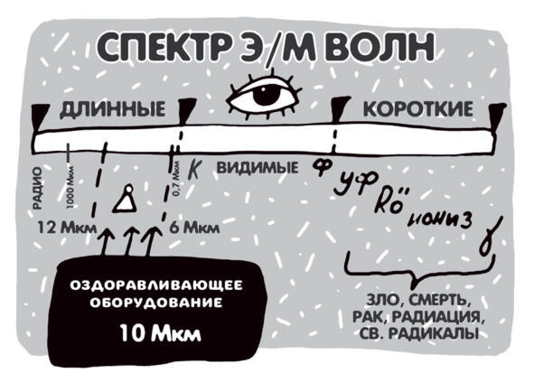 Волны, расположенные по другую сторону видимого спектра, за красным концом минимального спектра, это инфракрасные волны и радиоволны. И чем дальше к левой стороне спектра, тем больше длина волн. Весь спектр инфракрасных волн занимает от 0,7 до 1000 микрометров (мкм). Человек также излучает инфракрасные волны, но в более узком диапазоне от 6 до 2 мкм, его и называют биорезонансным.