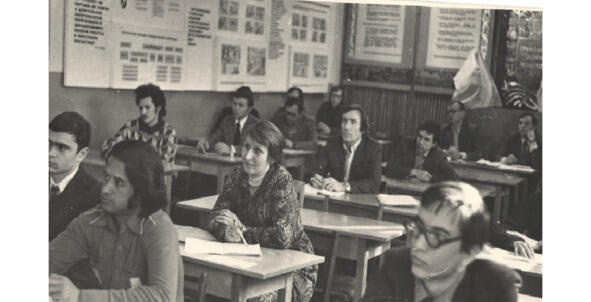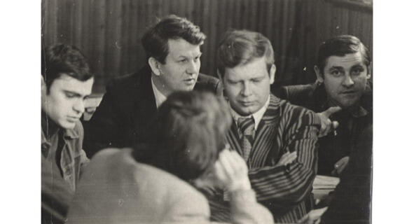 1-й выпуск школы ТРИЗ в 1974 году. 1-й ряд (спиной): Семен Литвин слушатель школы готовится к экзамену. 2-й ряд приемная комиссия.