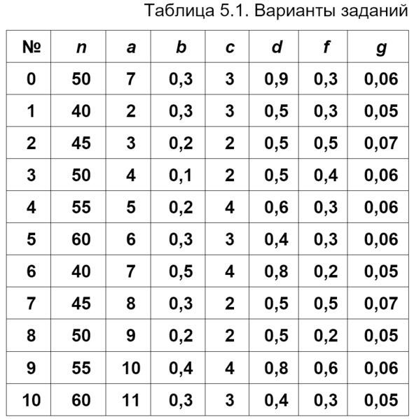 В таблице 5.1 приведены варианты заданий с 0 по 10. Нам предстоит вставить параметры своего варианта в отчёт. Пока что это просто семь чисел. В следующем разделе мы с ними познакомимся поподробнее.