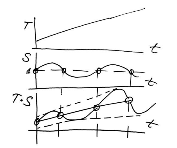На графике колебаний есть точки, где S проходит через единицу: S = 1. Если любое значение Т умножить на единицу, получим то же самое значение Т. Это значит, что в этих точках мы окажемся на линии тренда.