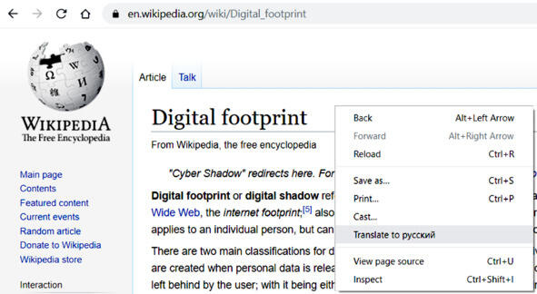 Получаем соответствующую английскую страницу «Digital footprint» (рис. 2.4). Если знания языка достаточно для чтения, можно почитать текст в оригинале. Ну а если знаний пока недостаточно или же человек изучал другой иностранный язык, есть запасной вариант.