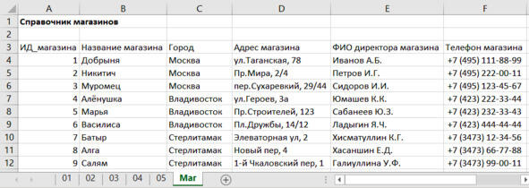 Создадим справочник магазинов в соответствии с нулевым вариантом. У нас будет три города, а в каждом городе по три магазина. Справочник разместим на новом листе рабочей книги Excel. Вкладку озаглавим «Маг». Названия на вкладках сделаем покороче. А вот заголовок на странице сделаем поподробнее и попонятнее: «Справочник магазинов».