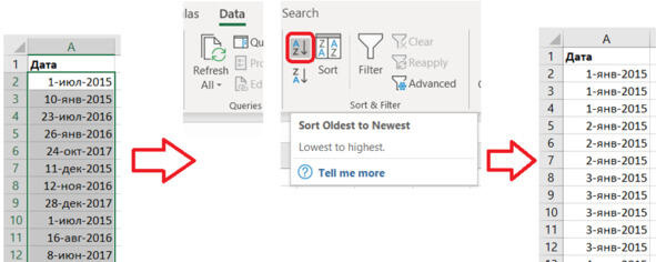 Теперь даты стали видны невооружённым глазом. Наведём красоту и расставим даты в порядке возрастания. Выделяем диапазон дат и выбираем в верхнем меню: