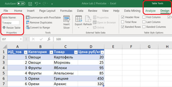 Дадим нашему объекту короткое понятное название, чтобы к нему было легко обращаться. Назовем его просто: «Товары». Для этого щёлкаем по любой ячейке таблицы и выбираем в верхнем меню