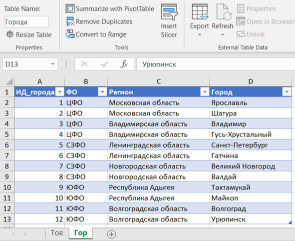 В первой части работы мы генерировали названия магазинов. По несколько штук в каждом городе. В данной работе мы остановимся на городах для знакомства с функциями сводных таблиц. Дальнейшую детализацию пока не будем рассматривать.