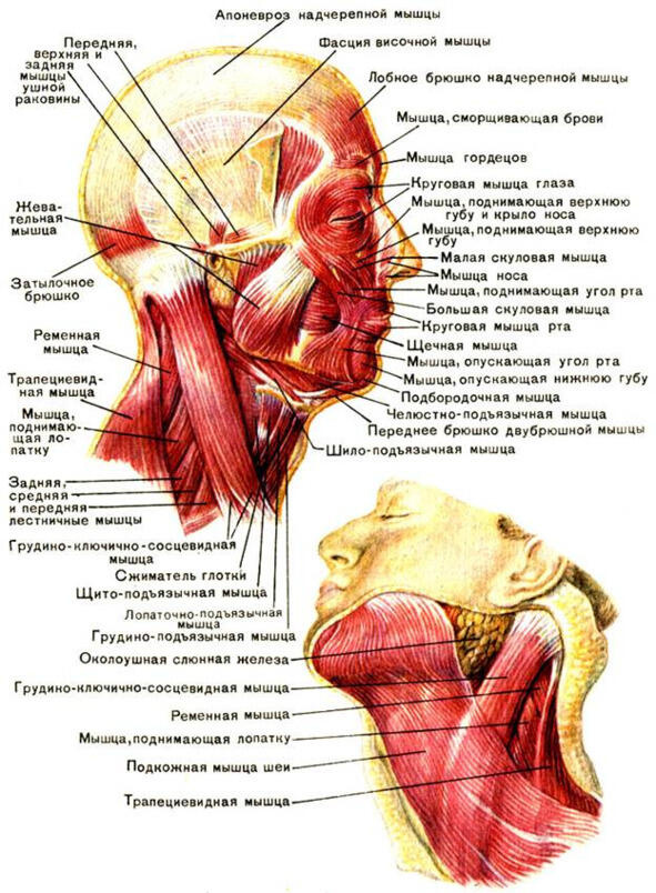 Ремённая мышца (32). При опоре на позвонках сокращение ремённой мышцы одновременно на двух сторонах производит разгибание головы, шейного и грудного отделов позвоночника, одностороннее сокращение поворот головы в сторону сокращающейся мышцы.