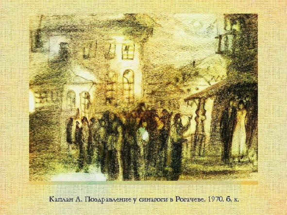 Эту историю мне рассказала Лия Моисеевна Штродт, давний друг семьи Анатолия Львовича. К 1918 году он уже окончил учительские курсы в Харькове и преподавал рисование в Рогачеве. Позже таких учителей собрали на конференцию в Витебске, где комиссаром по делам искусств был Марк Шагал. Он и надоумил Каплана ехать в Петроград, поступать во ВХУТЕИН, Высший художественнотехнический институт В 1973 году, когда через 50 лет эмиграции Шагала встречали в Ленинграде, ктото спросил, знает ли он такого художника, как Анатолий Каплан. В ответ Шагал поднял большой палец это описано во многих воспоминаниях»