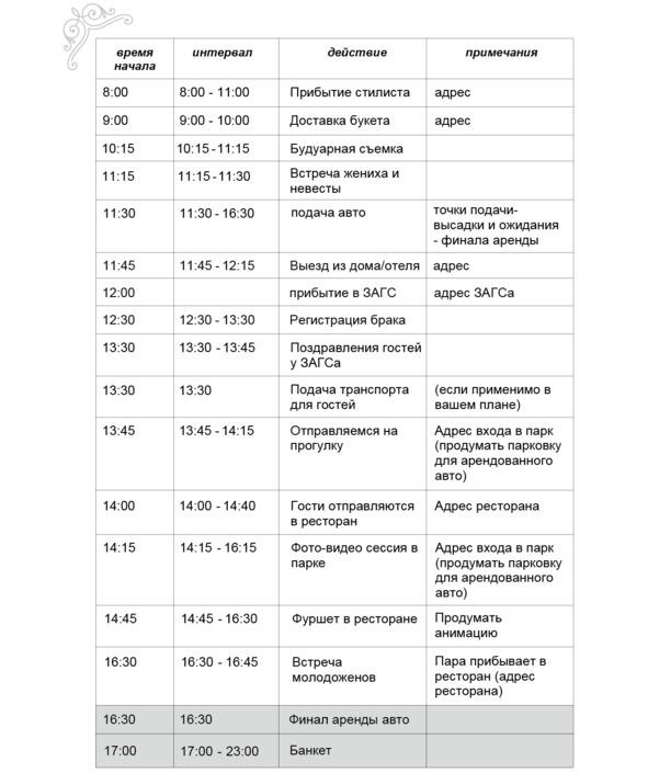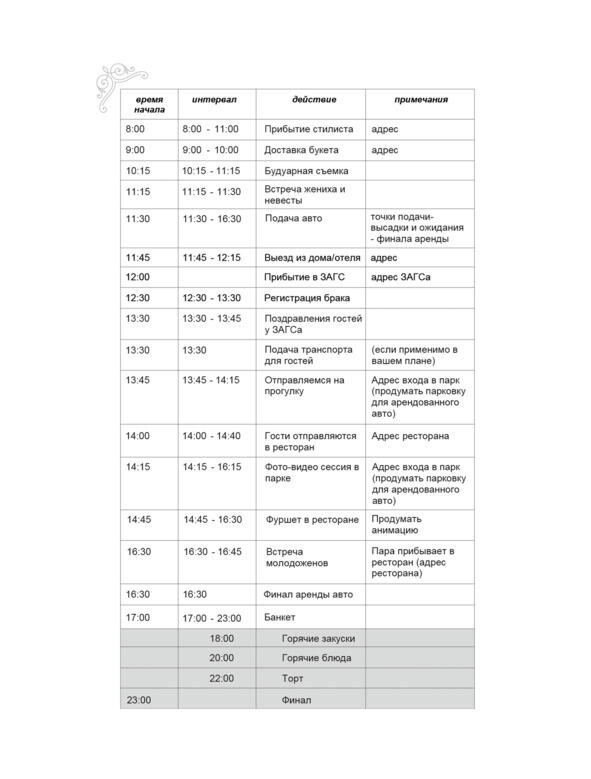 Конечно, в зависимости от ваших желаний, от места проведения свадьбы, от того, что вы захотите устроить, он будет меняться. Но основной принцип, надеюсь, вы поняли?