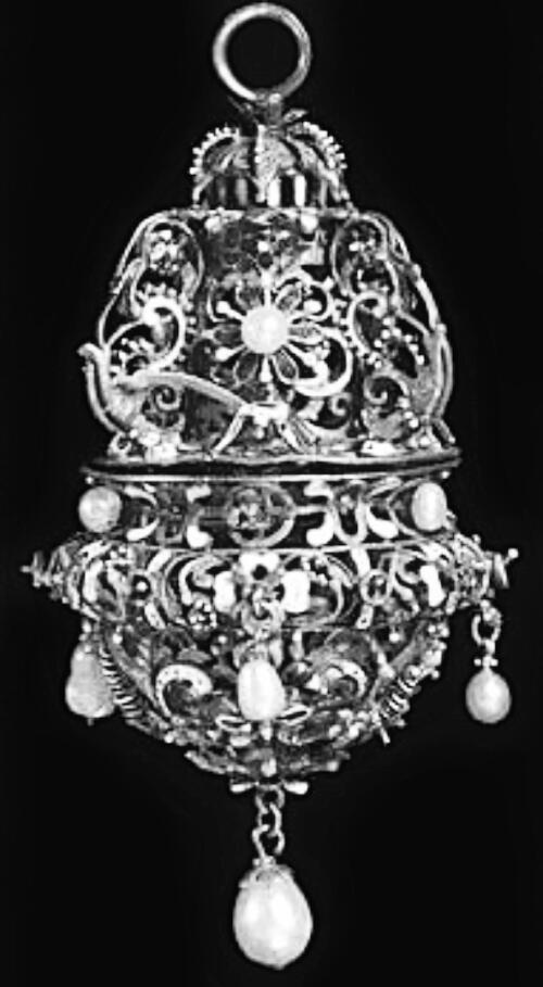 Следует заметить, что женские ювелирные украшения того времени, соответствуя особенностям одежды, были весьма своеобразны и даже носили иные названия. У знатной дамы шиньон охватывал украшенный жемчугом и драгоценными камнями ободок, шею туго облегало «каркане» короткое ожерелье, по краю корсажа укладывалась цепь, так называемый «котуар», на плечах же возле проймы рукавов размещалось колье, которое закреплялось на середине бюста, в этом же месте фиксировалась и подвеска. В качестве примера можно привести портрет Елизаветы Австрийской, жены французского короля Карла IХ (художник школы знаменитого мастера кисти Клуэ). Все эти названия отмирали по мере того, как выходили из употребления данные виды ювелирных украшений. Давно канули в прошлое и так называемые «помандеры» (по-французски это означало «мускусное яблоко»). Они представляли собой ажурные яйцевидные сосуды из драгоценных металлов, украшенных камнями и жемчугом, в которые закладывались ароматические вещества: гвоздика, корица, мускатный орех или кусочки амбры. Эти произведения ювелирного искусства подвешивались к поясу, дабы источаемый ими аромат заглушал неприятный запах от не знавших ни мыла, ни мочалки придворных и самих монархов. Известно, что Мария Медичи (которая сочеталась браком в родной Флоренции с французским королем Генрихом IV по доверенности с его представителем) по прибытии в новое отечество упала в обморок при первой встрече с мужем из-за исходившего от него ужасного запаха (новобрачный к тому же имел обыкновение сдабривать свои кушанья изрядным количеством чеснока). Мода на помандеры была чрезвычайно распространена, во всяком случае, в инвентарной описи драгоценностей короны Франции 1500 года их числится 54 штуки.