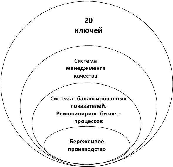 Видно, что внедрение СМК уже успешно реализует модели и бережливого производства, и управления по целям, и оптимизации бизнеса, и, тем самым, является основой для последующего внедрения (достройки до всей интегрирующей оболочки) самой привлекательной с точки зрения восприятия персоналом модели «20 ключей»!