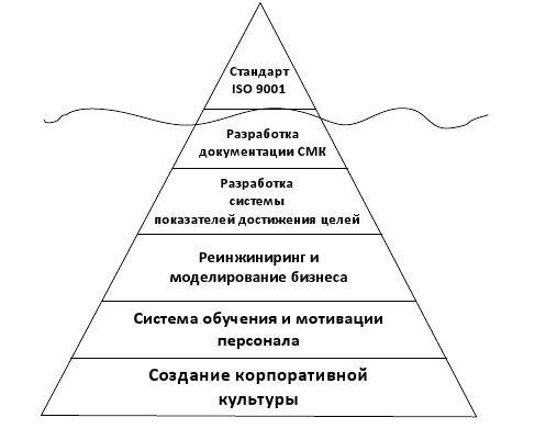 Таким образом, СМК напоминает «айсберг в океане»: у нее малюсенькая надводная часть в виде совсем небольшого текста стандарта ISO 9001 и громадная подводная часть реинжиниринга и моделирования бизнеса, системы мотивации, корпоративной культуры, разработки стандартов и т. д. (см. рис. 2.3).