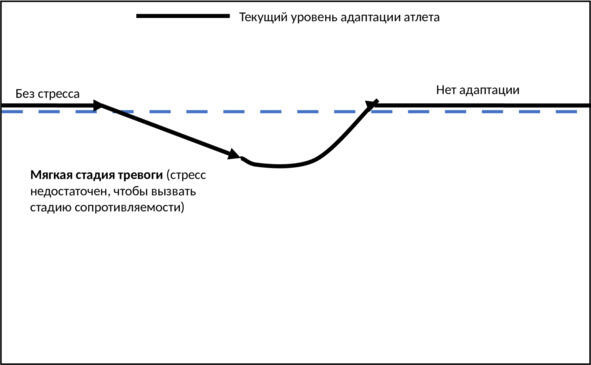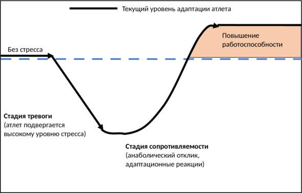 Подобная схема применима к любому стрессовому воздействию. Физическая, психологическая, умственная нагрузка создают стимул и последующую адаптацию. Для каждого рода стресса скорость приспособительных реакций разная. Для одних систем это несколько суток, для других несколько лет. Однако после наступления адаптации для последующего развития этой системе нужен более сильный стимул. Стимул одинаковой интенсивности приводит к кратковременному нарушению равновесия, но не вызывает дальнейшего приспособления. Это явление показано на рисунке ниже.