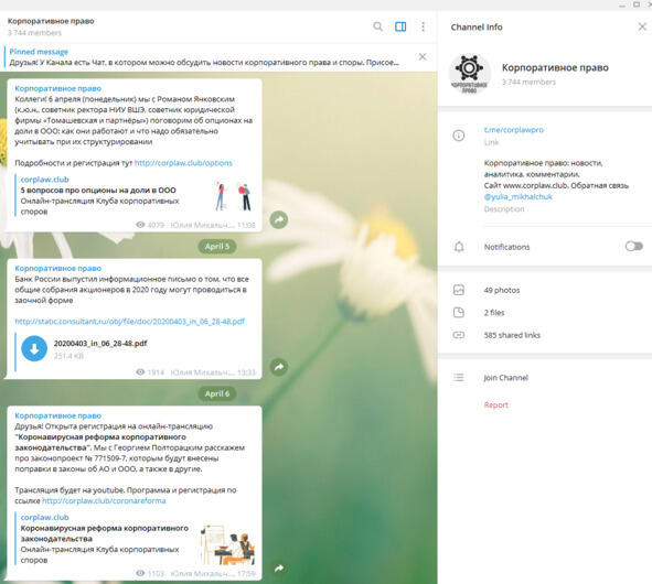 Телеграм-канал: Новости корпоративного права. На канал подписано более 3700 человек. Ведет Юлия Михальчук.