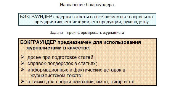 Бэкграундер не содержит новости и не является сообщением. Это очень «слабый» пресс-релиз и его вряд ли стоит распространять отдельно. Тем не менее это нужная и полезная штука, например, в составе медиа-кита или в качестве составной части пресс-релиза (справка о компании). В любом случае бэкграундер должен быть в арсенале и на странице пресс-службы компании в Интернете. Распространять бэкграундер отдельно имеет смысл, например, на старте деятельности компании. Но и в этом случае лучше дополнять бэкграундер сообщением и новостью, ведь старт деятельности компании это, в общем-то, какая-никакая новость и информационный повод.