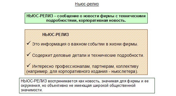 Закрепить за малозначимой узкокорпоративной новостью термин «ньюс-релиз» позволяет использование этого же термина в хозяйственном праве. В словаре экономических терминов «ньюс-релиз» это «данные о товаре или компании, представленные в виде описания, аналитического обзора и используемые при заключении договора». В этом определении тоже отмечена важная характеристика: ньюс-релиз это сообщение о компании, которое имеет узкокорпоративное значение.