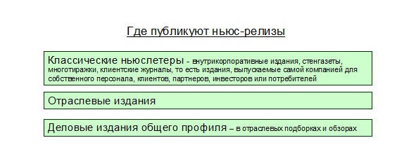 Кроме того, ньюс-релизы нередко публикуются в неизменном виде во внутрикорпоративных СМИ, отраслевых изданиях, а также в профильных подборках деловых новостей в деловых СМИ.