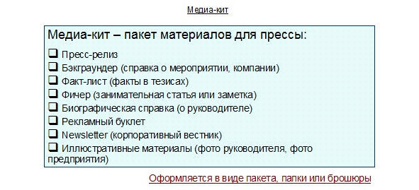 Зацикленность пресс-службы и болезненную зацикленность пресс-секретарей на своих драгоценных пресс-релизах надо лечить простым терапевтическим приемом созданием медиа-кита компании. Пресс-служба, создавшая полноценный медиа-кит, более адекватно относится к своим пресс-релизам, а ее пресс-релизы становятся более эффективными. Просто возникает правильное понимание масштаба тех или иных усилий, их адекватности и вклада в общий успех.