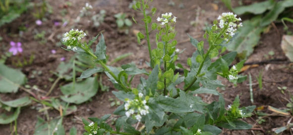 Вот это и есть ярутка, указал я на ярутку. Наша ярутка относится к семейству крестоцветных, и она родственница капусте и сурепке. Розетки листьев ярутки ярко зелёные, блестящие, листья цельные, ланцетные, слегка волнистые. Они имеют характерный чесночный запах. Отчего это растение получило своё второе название ярутка, точно неизвестно. Быть может от названия круглого ячмённого или овсяного хлеба ярушника, который пекли в Вологодской губернии во времена А. С. Пушкина. Ведь семена ярутки, очень походили на эти хлебы.