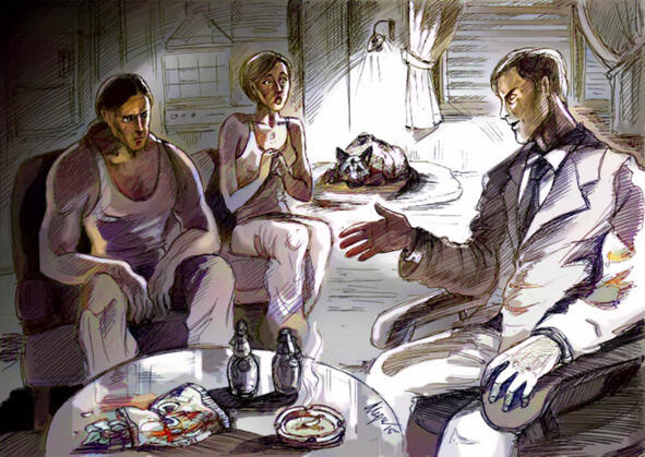 Все трое прошли в салон, мужчины сели в кресла, а женщина принесла несколько бутылок пива и чипсы.