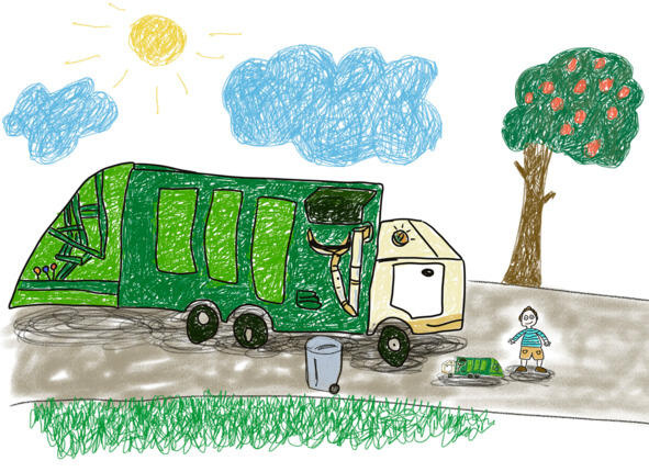 Привет! как можно ласковее говорит мусоровоз. Голос у грузовика громкий, ему не хочется пугать малыша. Как тебя зовут? гудит он.