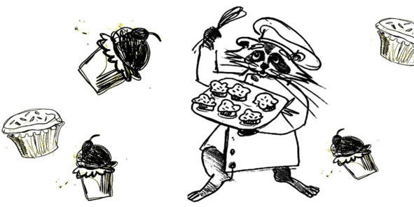 Енот взял мел, с сияющей улыбкой прошел через зал с посетителями, поприветствовав вновь прибывших, и принялся старательно выводить надпись на двери:
