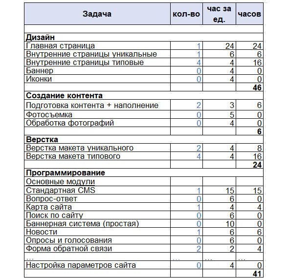 4. Создаем базу видов работ (там же в табличке) для каждого из этапов разработки. Например: дизайн (главная страница, внутренняя страница, обработка фото и т.д.), программирование (подключение стандартной CMS, модуль «Вопрос-ответ», модуль «Каталог продукции» и т.д.). На каждую работу готовится краткое описание, пример реализации и оценка в часах. Почасовую оценку типовых задач достаточно провести один раз, собравшись с разработчиками. Нестандартные модули добавляются в расчет и оцениваются для каждого нового проекта.