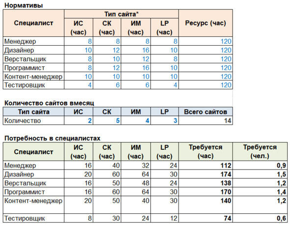 Чуть выше для каждого типа сайтов мы определили нормативы по этапам. Теперь можно рассчитать, сколько каких специалистов потребуется, чтобы выпустить нужное количество сайтов согласно бизнес-плану. Для этого создайте таблички по примеру ниже и настройте формулы расчета количества профильных специалистов. Поле «Ресурс» в первой табличке содержит количество часов, который специалист тратит на работу в месяц. Мы считаем это равным 120 часам, хотя по факту это число может быть больше. Синие значения это то, что вы вводите вручную. Черные должны рассчитываться автоматически.