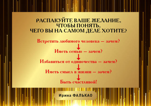 Цель этого упражнения задавать себе вопросы до тех пор, пока вы не распакуете свое желание полностью и не поймете чего вы на самом деле хотите. Что ваша конечная цель? Как вы видите свою идеальную жизнь?