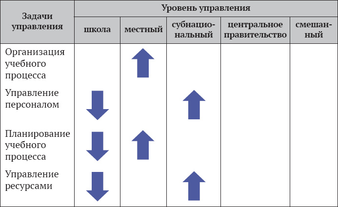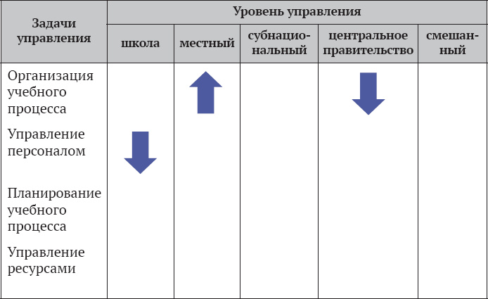 Если в Нидерландах школа принимает самостоятельно решения по 92 % вопросов, то, например, в Греции только по 8 %. В Турции и Люксембурге центральное правительство принимает решения по более чем 70 % вопросов управления школой, а в Чешской Республике и Германии практически не участвует в управлении школой. Местные органы власти играют существенную роль в управлении школой в США, Канаде и Швеции и минимальную в Германии, во Франции и в Мексике. Такой разброс поднимает два вопроса: