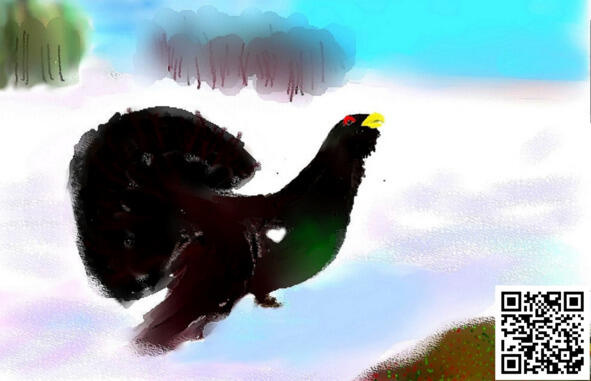 Глухарь упруго упал в снег недалеко от темнеющего взгорка, бултыхнулся несколько раз в холодном сыром крошеве, взбивая крыльями тяжёлую белую взвесь, затем отряхнулся, распустил по-павлиньи чёрный с белой круговой полосой хвост и поковылял на седых опушённых лапах к прогалине.