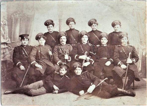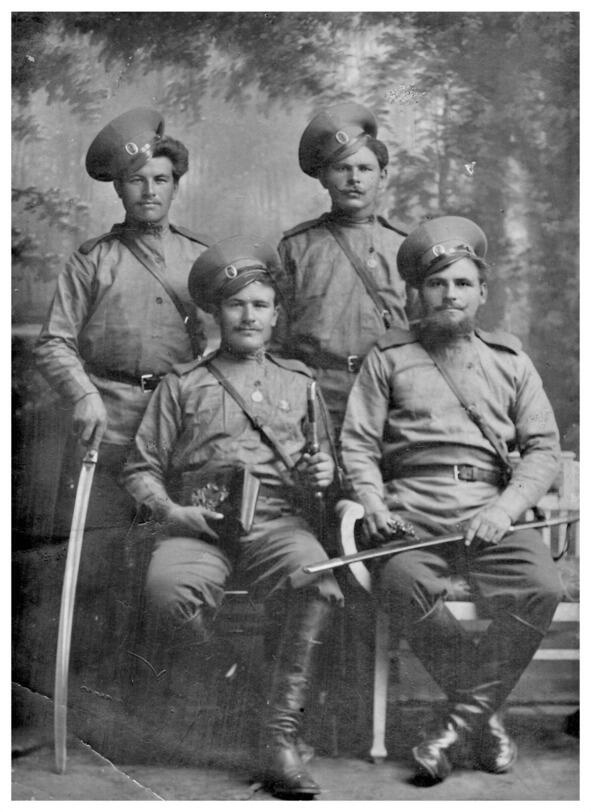 Слева на право стоят: Швечиков, Швечиков, Борисов, Иванков. Слева на право сидят Севостьянов, Фильчуков, Быкадоров, Васильев, Нефёдов, Павлов. Лежат Усачёв, Павлов. Казаки станицы Митякинской.