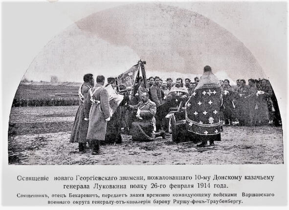 Передача освященного юбилейного Георгиевского знамени 10 Донского казачьего генерала Луковкина полка образца 1900 г.