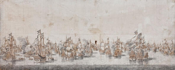 Датский ост-индец отстреливается от шведского капера. Судя по всему, у последнего не получится разжиться призом в этот раз.