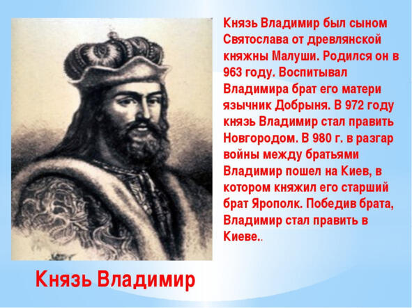 «Князь Киевский Владимир, которого позже стали именовать Великим, в конце X в. твердо решил, в какую веру будет обращать свой народ и обратится сам. По легенде, из-за запрета на алкоголь ислам даже не обсуждался. В итоге Владимир предпочел Риму Византию и открыл двери православию. Примечательно в легенде то, что Россия при всей многолетней славе не всегда была водочной державой. С водкой на Руси познакомились только пять столетий спустя после появления крепкого напитка, поэтому отвергший ислам Владимир со своими подданными отдавал в X в. предпочтение иным напиткам меду, квасу и пиву. Русское слово хмель означает, как известно, и пряное растение, входящее в состав пива (лат. Humulus lupulus), и состояние опьянения, вызываемое алкоголем. Это также наводит на мысль, что пиво в качестве опьяняющего напитка занимало первое место. Позже ситуация изменилась. Самое раннее упоминание об изготовлении водки в России датируется 1558 г. И уже в конце того же столетия пошли жалобы на то, что водка стала народным бедствием».