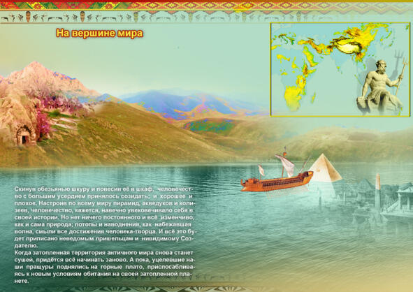 Когда затопленная территория античного мира снова станет сушей, придётся всё начинать заново. А пока, уцелевшие наши пращуры поднялись на горные плато, приспосабливаясь к новым условиям обитания на своей затопленной планете. Они заселяли пещеры и скальные расщелины. Многое приходилось начинать заново. Менялись условия жизни и существования первобытного человека, менялись места охоты и промысла. Новые животные попали в окружение первобытных охотников.