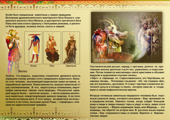 Козёл был священным животным, и славянского бога Перуна. Вспомним рогатого греческого бога Пана или кельтского Цернуну, и рогатого бога друидов, хозяина лесов, охоты и зверей. А ведуны, кудесники и служители древнего культа, украшали голову рогами этого священного животного. Именно этот человек, высекающий ведические знаки на камне, и окружённый ореалом божественности, внушал животный страх соплеменникам. В его, недоступных пониманию, иероглифах заключена тайная сила природы. Ритуальной одеждой ведуна была «рогатая шкура», с аксессуарами различных животных, олицетворяющих данную природу. А на голове были козлиные рога. И этот ведун, воздействуя на испытуемого и на толпу, вызывал духов Рода, «природы», опаивая их наркотическими травами.