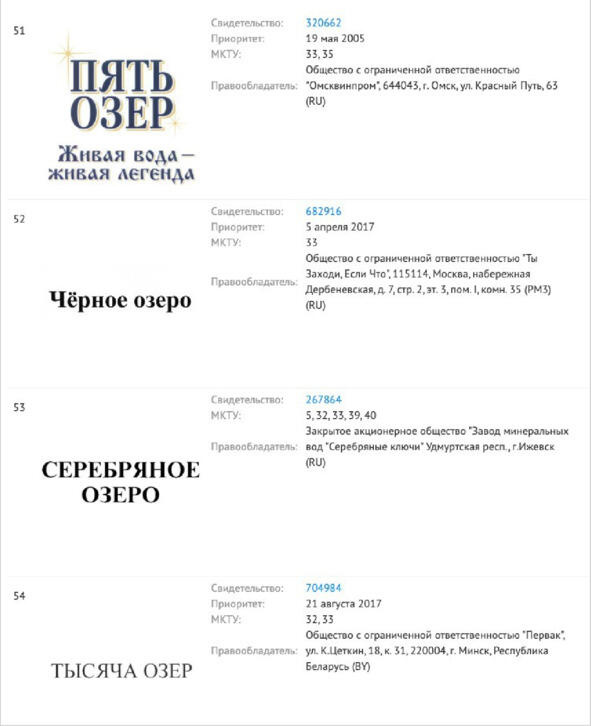 Производители водки очень любят слово «озеро». Я насчитал 42 подобных товарных знака, еще 17 заявок получили отказ. Трюк не сработает, если название выдуманное: у них слишком сильная различительная способность. «Кристальное озеро» и «Белое озеро» различаются, «Яндекс» и «Кристальный яндекс» нет