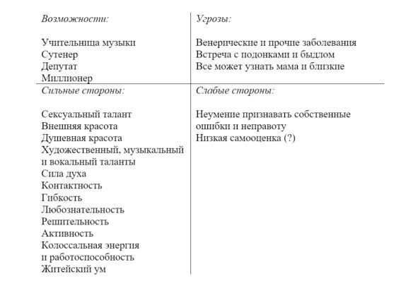 Моя же героиня родилась со знанием этих понятий, или, как говорят, впитала их с молоком матери: все ее поступки обусловлены знанием матрицы возможностей и пирамиды потребностей на уровне инстинктов.