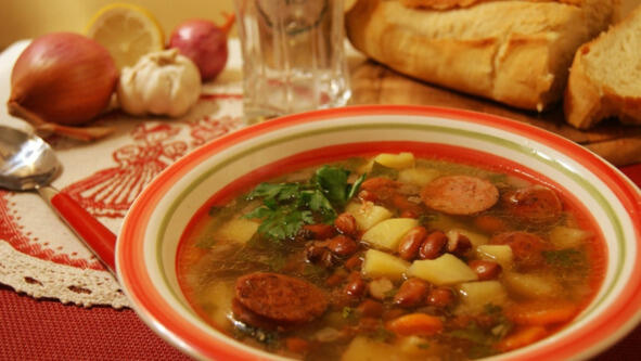 3 шт. картошки, 1 луковица, 1 морковь, 5 шт. колбасок 260 г, 2 ст. л. томатного кетчупа, 1 банка красной консервированной фасоли, соль, перец, растительное масло для пассировки, зелень.