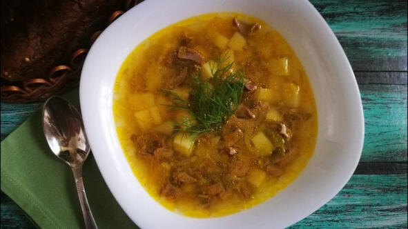 В конце варки добавить нарезанную зелень петрушки и чеснок. Снять с плиты, дать супу настояться.