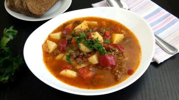 Говяжий фарш 300 г, репчатый лук 1 шт., болгарский перец 1 шт., морковь 1 шт., картофель 400 г, вода 400 мл, помидоры 500 г, растительное масло б/з 50 мл, чеснок 2 зубчика, зелень петрушки, соль 1 ч.л. без горки, чёрный перец, прованские травы 1 ч.л., сухой базилик 1 ч.л., зира 1 ч.л., острый чили перец в порошке 0,5 ч.л.