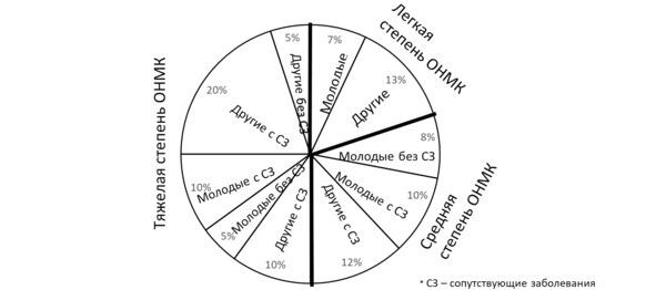 В этом случае стоит разобраться, на какие нозологические ниши делит врач своих пациентов. Деление на нозологические ниши у врача может быть в соответствии с современной классификацией, а может быть и совершенно произвольно. Например, лежачие/ходячие, платежеспособные/неплатежеспособные, работающие/пенсионеры, молодые / среднего возраста / пожилые, с сопутствующими заболеваниями СЗ (сопутствующие заболевания) / без сопутствующих заболеваний. На рисунке 1.6 схематично представлен вариант деления пациентов с нозологией ОНМК.