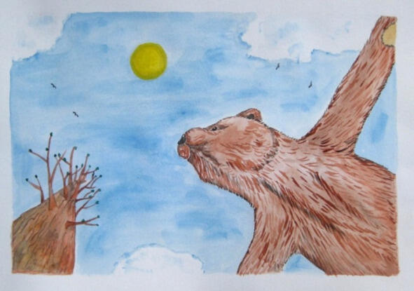 Медведь встал на задние лапы, почесал у себя за ухом, подумал немного, потом как побежал на нас, не добегая 30м он подпрыгнул и полетел по воздуху. Вы представляете, как эта громада пролетела прямо над нами, мы пригнулись, а он, пролетев ещё метров сто, спланировал на небольшую полянку, приземлился, оглянулся на нас и пошёл вниз.