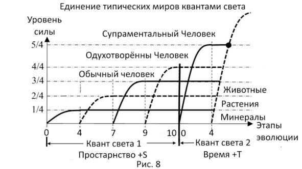 На рисунке 8 уже показано взаимодействие двух квантов света, которое мы ещё ранее не исследовали. До сих пор мы исследовали только квант света 1, который сформировал нам четыре цивилизации. Квант света 2 продолжает действие кванта света 1 и добавляет к ним ещё две будущих цивилизации или два новых типических мира: мир Верховного разума, который даст новый вид одухотворённого Человека а4, и мир Сверхразума, который даст новый вид супраментального Человека а5.Они уже известны нам и поэтому мы и говорим о двух будущих циклах эволюции [2], ибо её другие циклы нам пока неизвестны.