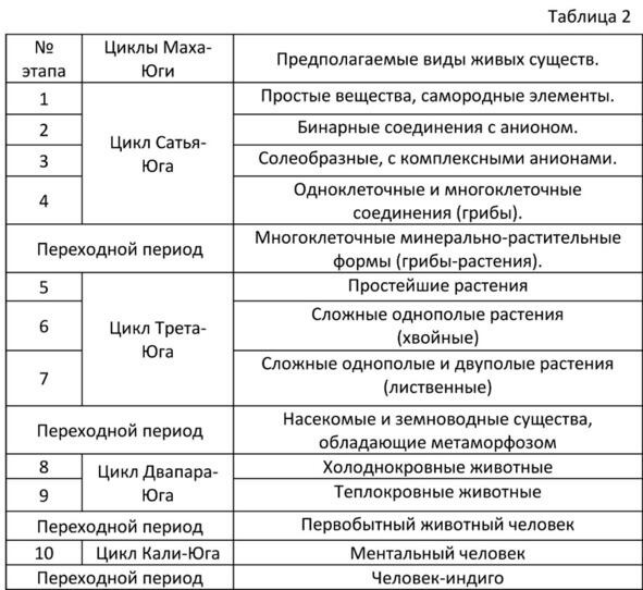 Между циклами обязательно существуют переходные периоды, которые позволяют материальным формам адаптироваться к новому основному состоянию Материи. Они соединяют между собой предыдущий и последующий циклы эволюции. Без такого единения миров в переходном периоде невозможен никакой эволюционный переход. Поэтому в переходном периоде обязательно присутствуют старые и новые виды одновременно, как переходной вид: плазмо-минералы а0+, грибы-растения а1+, насекомые, пресмыкающиеся и земноводные существа а2+, обычный человек а3+. Не минует он и нашу цивилизацию, в которой мы предполагаем новый переходной вид человека-индиго а3++. Именно он должен будет привести нас к одухотворённому Человеку мира Верховного разума а4.