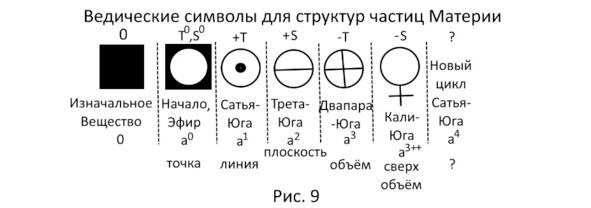 Эти ведические символы рисунка 9 помогут нам лучше понять принципы формирования структур частиц Материи от цикла к циклу. На нём уже обозначены измерения её будущих структур и их геометрические описания. Всё это связано с названиями меньших циклов Маха-Юги, которые у нас напрямую завязаны на периоды кванта света рисунка 3 (+T, +S, -T, -S). Нам более ничего не остаётся, как начать такое описание структурной эволюции частиц в Материи.