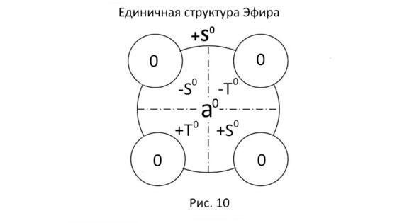 Ранее мы определились, что все единичные частицы Эфира представляют собой свёрнутые в точку элементарные структуры Нави (ЭСН) [3], как это показано на рисунке 10. На этом рисунке ЭСН принадлежит большему единичному положительному пространству +S0, которое формируется квантом света 1. Все её сектора обозначены единичными пространствами и временами с разными знаками состояний. Они заполняются нулевыми частицами Вещества. Единичная структура а0 будет формироваться из четырёх нулевых структур, которые послужат ей первыми частицами.