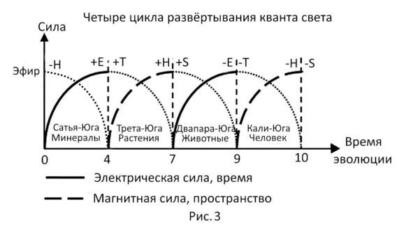 Каждая цивилизация развивала соответствующую своему циклу структуру жизни и свой типический мир [1]. Это нас навело на мысль, что ведические циклы развития цивилизаций могут совпадать с периодами кванта света. Давайте попробуем их совместить с его структурой, для чего составим рисунок 3. Периодов кванта света по рисунку 3, как и ведических циклов, также будет четыре.
