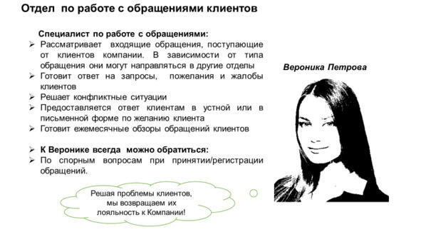 Вы поможете новому сотруднику, если кратко скажете не только то, чем занимается человек, но и по каким вопросам к нему можно обращаться.